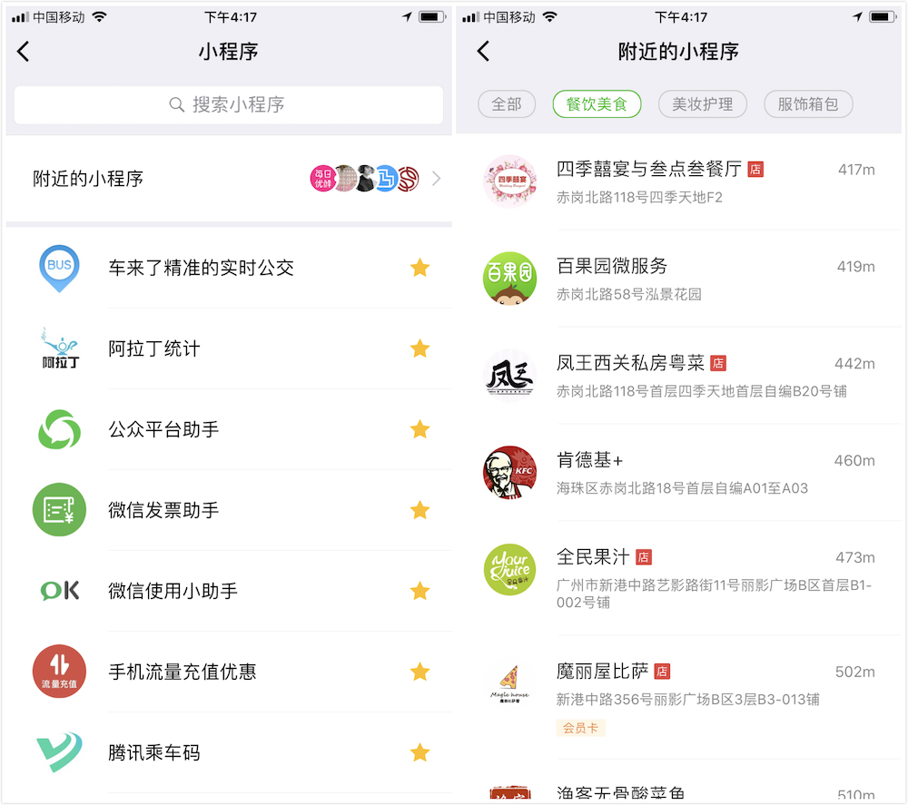 如果说除了广告之外,微信很少主动做出推荐,对用户施加平台力量。那么,为了力捧小程序,微信甚至开始对用户做出主动推荐,比如「附近的小程序」,在搜索内容中推荐小程序等等。虽然小程序应用栏还只能用加「星标」的方式进行选择,但随着应用的过载,以及商业利益的推动,微信必然会选择一种更为有效的展示、推荐方法予以协调。